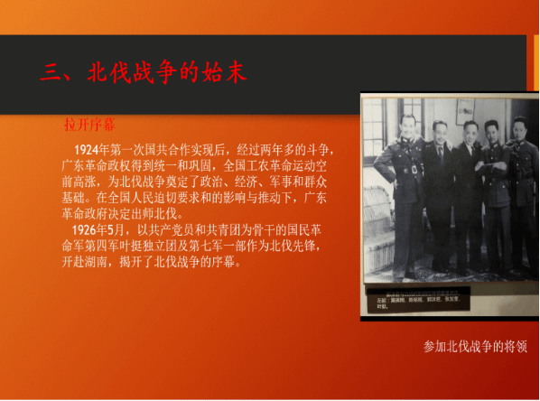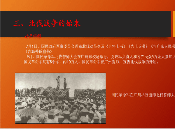网络空间安全一班的主讲人梁家旺同学对北伐战争的过程进行了重点概述:论述了辛亥革命失败后北洋政府腐败无能,军阀内部派系林立,军阀割据一方。广大人民生活在水深火热之中。1924年国共两党形成了统一战线。1926年2月举行特别会议,明确指出党在目前的主要任务是推动广东势力向北发展。1926年7月9日广东国民政府领导的国民革命军十万人正式出师北伐。明确了北伐战争是1926年到1927年发生在中国大地上的,由广东国民政府发动的反对北洋军阀的革命战争。