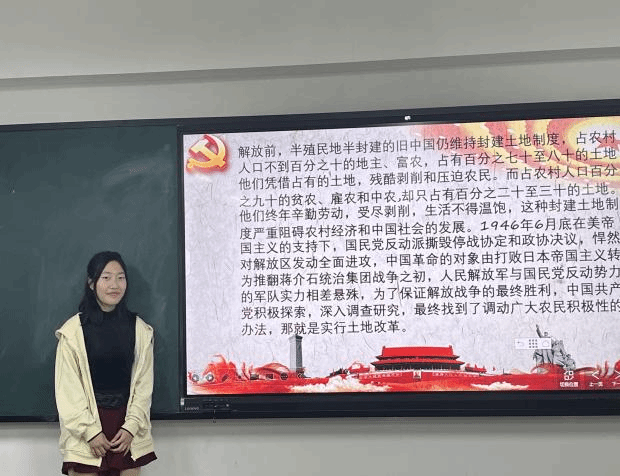 2022级网络空间安全一班的李紫琪同学和网络空间安全三班的白雨欣同学主要介绍了土地改革的内容。土地改革是中国人民在中国共产党领导下,彻底铲除封建剥削制度的一场深刻的社会革命,是中国民主革命的一项基本任务。中国共产党在民主革命时期,就提出了彻底的土地革命纲领,领导了解放区的土地改革。新中国成立前,占全国面积约三分之一的东北、华北等老解放区已基本完成土地改革,消灭了封建剥削制度。