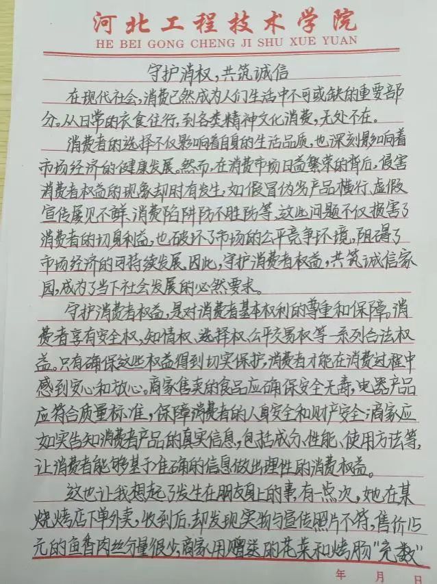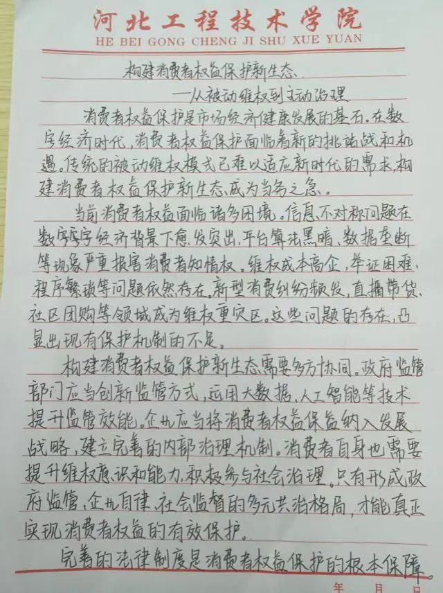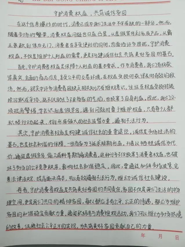 活动期间,同学们围绕主题,结合自身经历、社会现象等展开创作。有的同学分享了自己遭遇消费欺诈的经历,详细阐述如何运用法律武器维护自身权益,为其他同学提供了实用的维权经验;有的同学则从宏观角度探讨诚信在市场经济中的关键作用,呼吁大家共同营造诚信的消费环境。一篇篇征文主题鲜明、内容丰富,展现出同学们对消费权益和诚信问题的深刻理解。