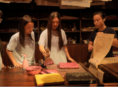 八十年前,武强年画的刀痕里全是抗战烽火,《打日本救中国》刻着军民死战决心,《大战天津》画着同仇敌忾的抗争,每一刀都是艺术化作的 “武器”,记录着中华儿女以血肉筑长城的岁月。团队队员在博物馆尝试拓印:蘸墨、铺纸、轻擦,看着梨木板上的抗战纹样慢慢显形,指尖触到木版的凹凸,才懂当年艺人把呐喊刻进纹理的赤诚。