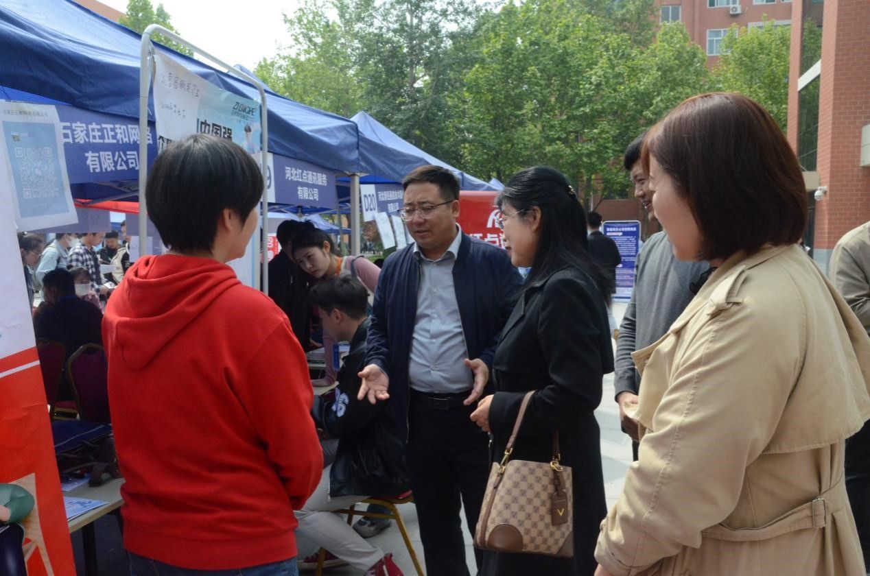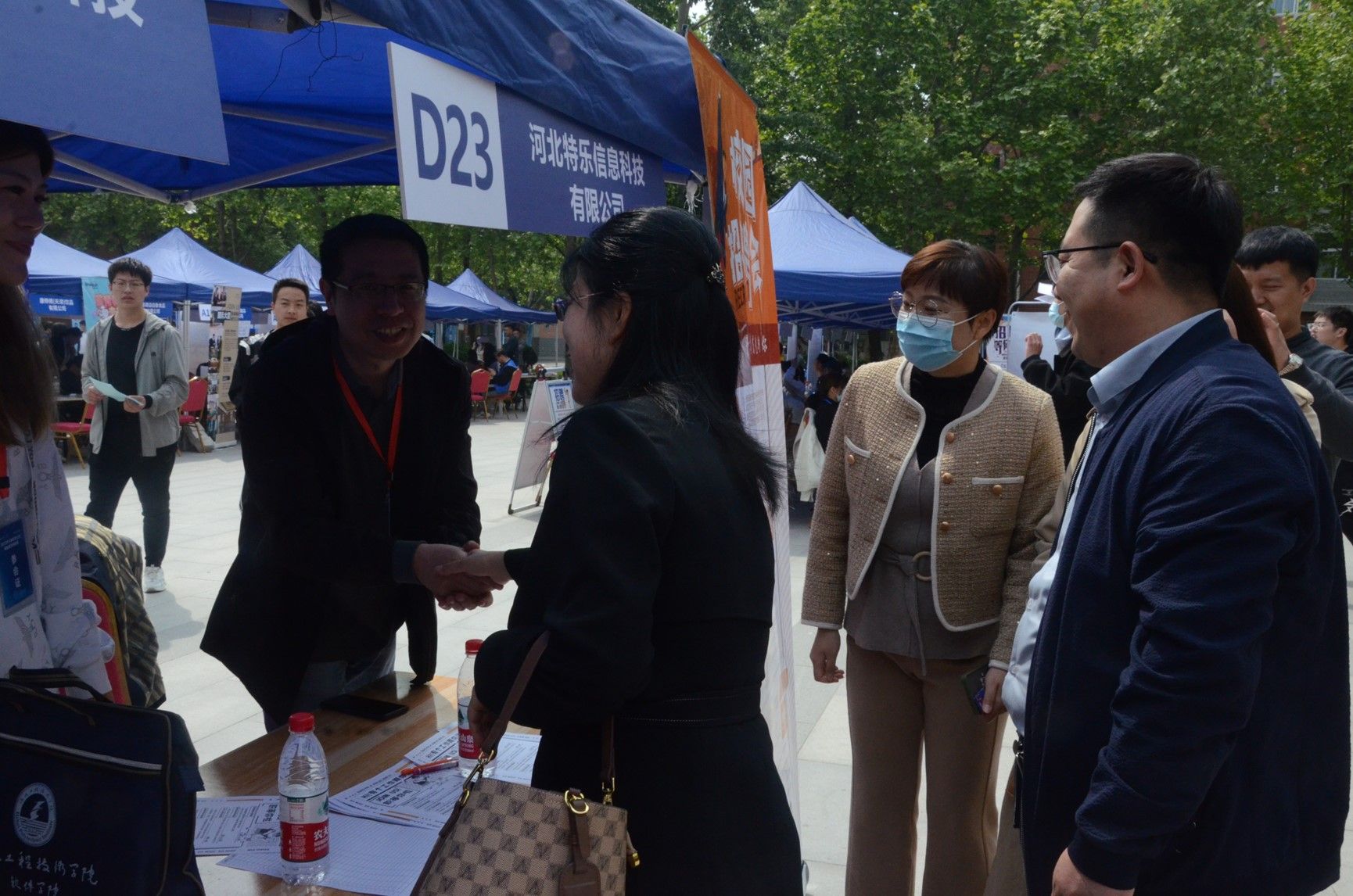 4月27日上午,软件公司协助市人社局、市教育局联合举办了“就业在‘冀’·职引未来”2023年石家庄市公共就业服务进校园软件和信息技术服务行业招聘会。在招聘会现场,软件公司赵冬梅经理、党总支书记王亚杰、教学副经理张波,特意与河北特乐信息科技有限公司、河北乐坤信息技术有限公司、河北博岳通信技术股份有限公司、河北红点通讯服务有限公司、平安普惠信息服务有限公司石家庄第一分公司、石家庄文腾商贸有限公司、石家庄朗宁体育用品科技有限公司等7家企业进行现场岗位对接交流。