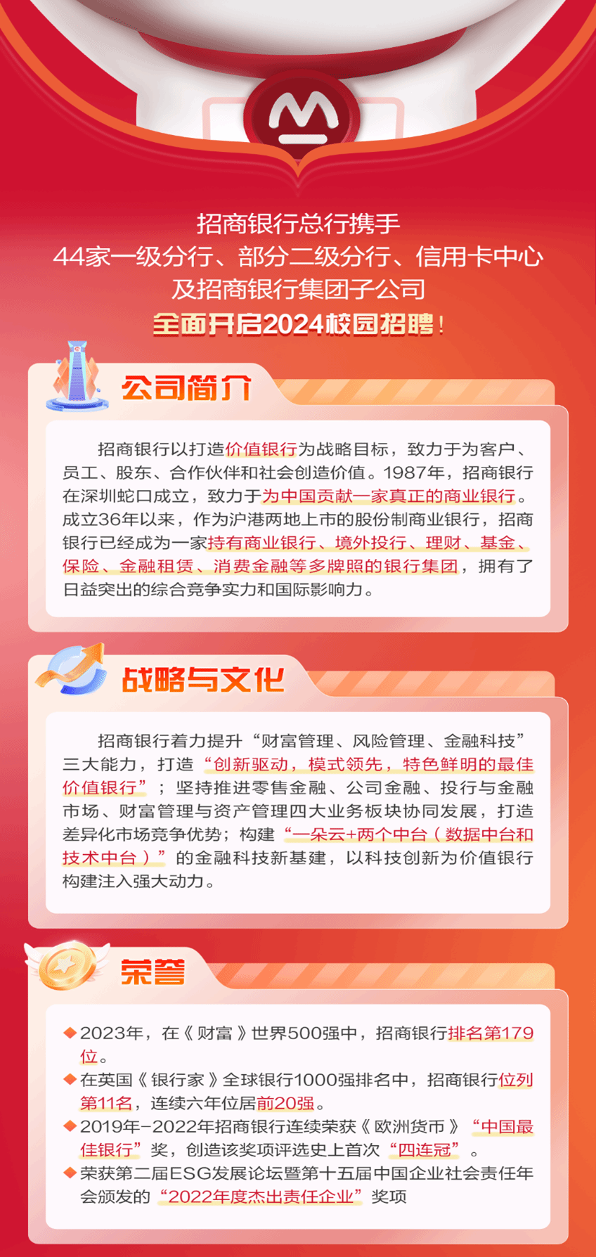 招商银行总行、分行、信用卡中心及子公司2024校园招聘虚位以待,邀您同行,梦想靠岸!