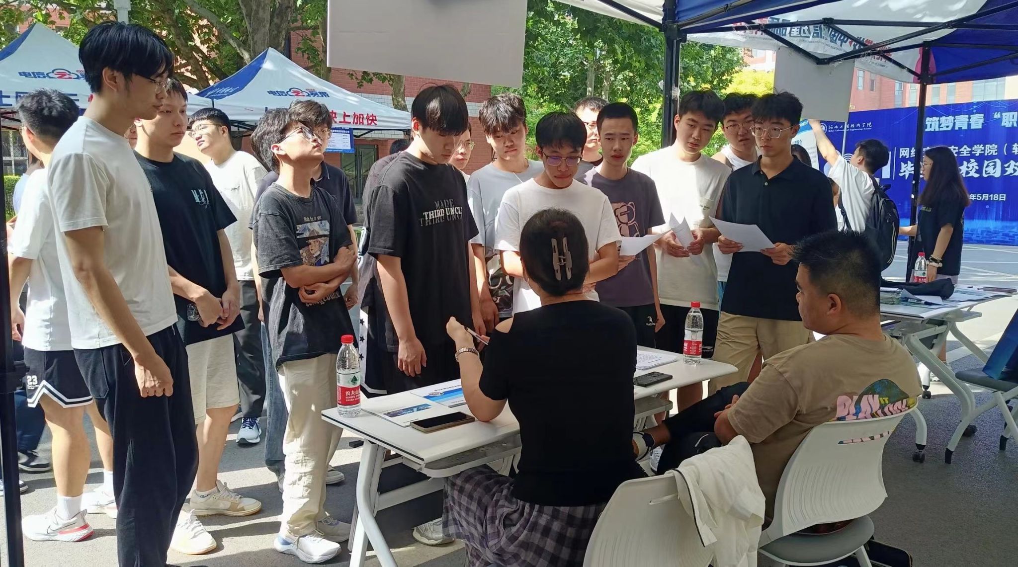 在招聘会现场,毕业生们与用人单位面对面交流,了解公司的招聘需求、就业工作内容及薪资待遇等方面情况,面对毕业生们的积极提问,企业负责人们热情回应,认真回答他们的问题。毕业生们手持个人简历,与企业沟通后把个人简历以及获奖证书直接投递给心仪的企业,部分企业也会根据员工投递简历情况组织现场笔试,以便后续参加企业面试。其他年级的员工也积极关注此次招聘会,在现场询问企业负责人当前就业形势与企业岗位需求,为自身的职业生涯提前做好规划,找准求职方向。