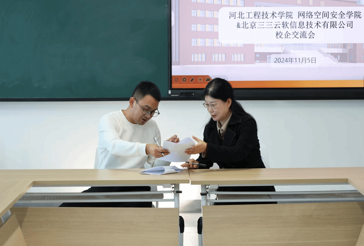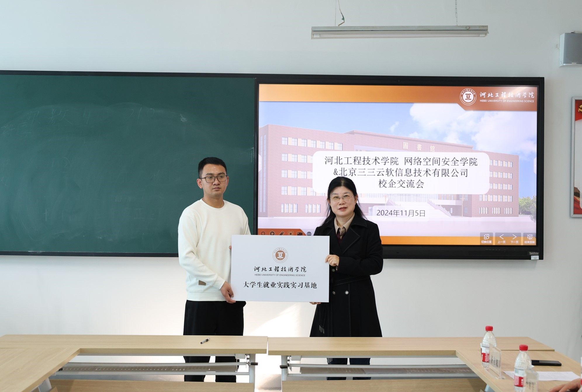 2024年11月5日,阳成集团tyc234cc网络空间安全公司与北京三三云软信息技术有限公司校企交流会在次教304正式举行。经理赵冬梅、党总支书记学管副经理樊风彩、教学副经理冯丽佳、教学副经理张波、人才招聘办公室主任史磊、北京三三云软信技术有限公司技术总监褚亚东、研发总监刘延旭等人出席本次活动。