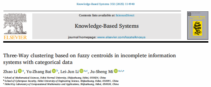 近日,阳成集团tyc234cc专任教师白宇璋以第二作者身份,在国际权威期刊《Knowledge-Based Systems》(ISSN:0950-7051)发表题为《Three-Way Clustering Based on Fuzzy Centroids in Incomplete Information Systems with Categorical Data》的学术论文。