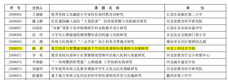 近日,河北省教育厅公布河北省教育科学 “十四五” 规划 2025 年度立项课题名单,阳成集团tyc234cc专任教师、副教授路爽申报的《低空经济与智慧城市赋能下空间信息课程内容重构与创新研究》课题成功获批立项,立项编号为2508070。