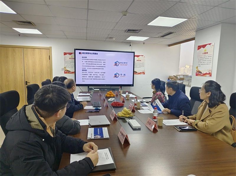 会上,主持人张波副经理首先介绍了出席此次考察的领导,并对河北网信智安信息技术有限公司给予公司实习实训工作的支持表示感谢。随后,林峰总经理就实习实训基地建设情况进行了详细汇报。林总介绍了公司的基本情况,包括公司的发展历程、业务范围、核心技术团队等。在产品与技术实力方面,展示了公司自主研发的一系列网络安全产品,如网络安全监测系统、数据加密软件等,并阐述了相关技术在行业内的领先地位。他强调,公司始终致力于网络安全技术的创新与应用,为客户提供全方位的网络安全解决方案。