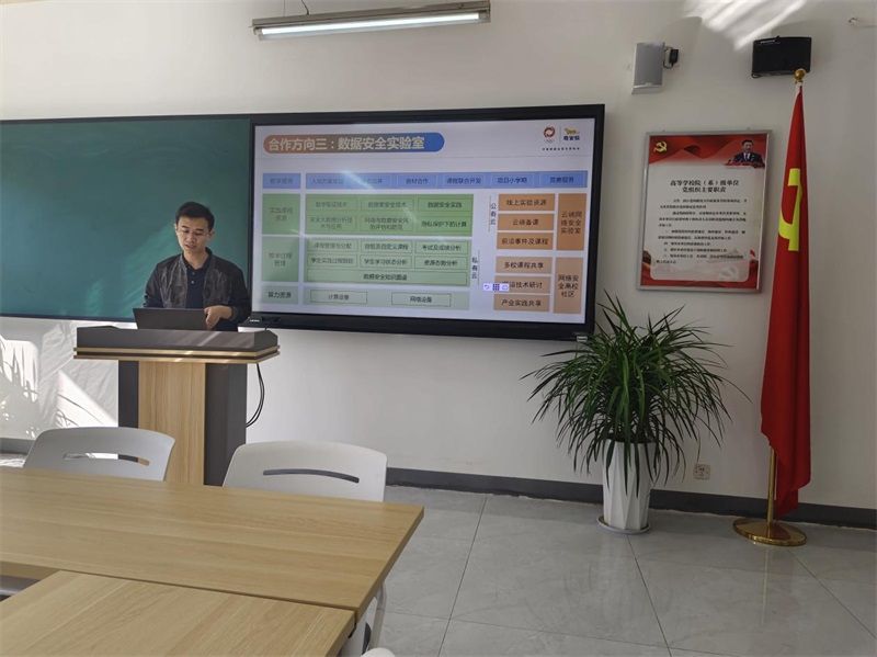 校企双方代表在软件公司会议室举行了校企合作洽谈会。基于前两轮的校企合作细节的沟通,奇安信集团高校合作中心解决方案专家付茂盛介绍了更为详细的合作计划,包括人才培养、实验室建设、科研合作、竞赛开展、实习实训、团队培养等方面可以开展合作的细节。